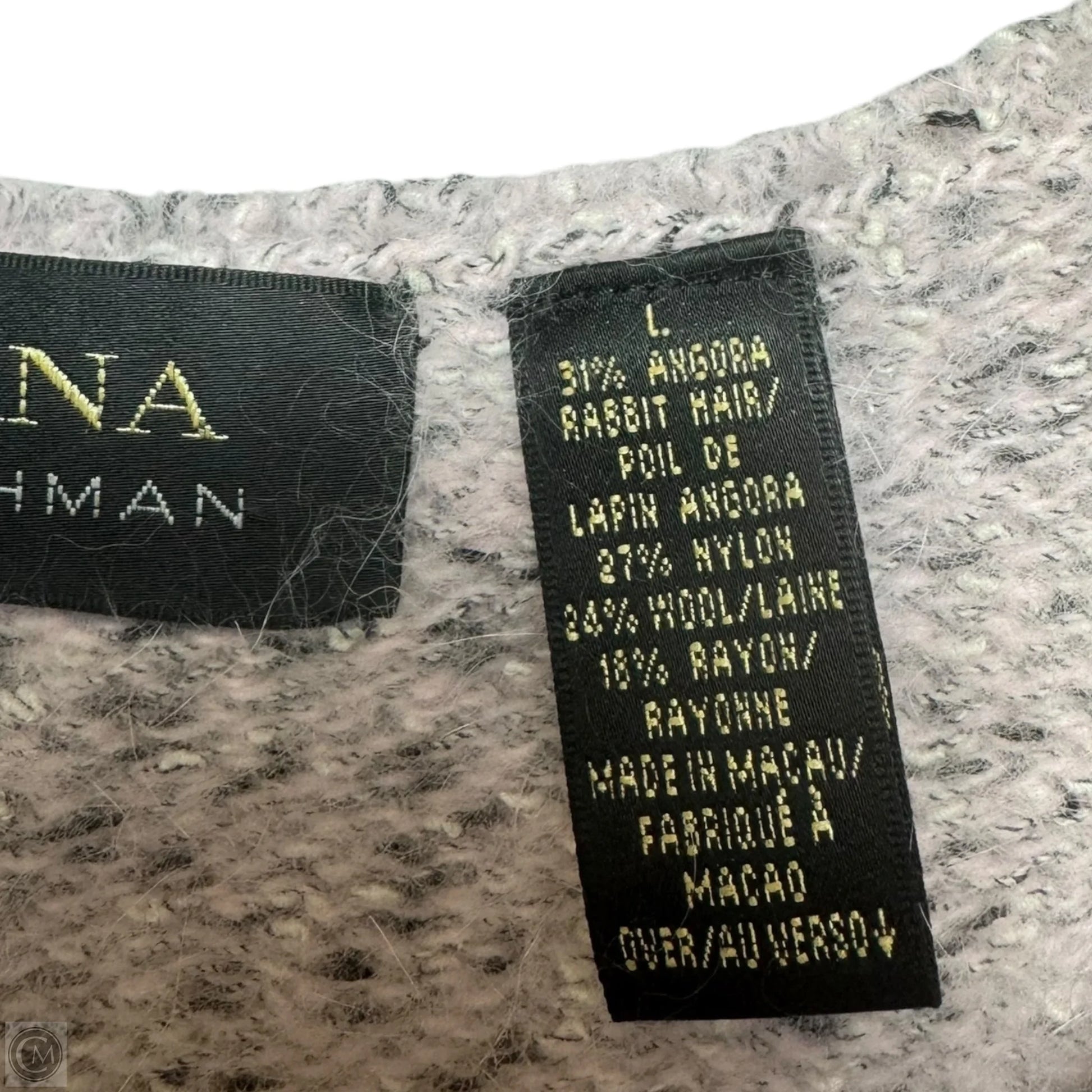 Get cozy in this whimsical angora blend sweater by Dana Buchman. In charming grey and pink, size L. Embrace comfort and style effortlessly. Stand out in soft, playful elegance.