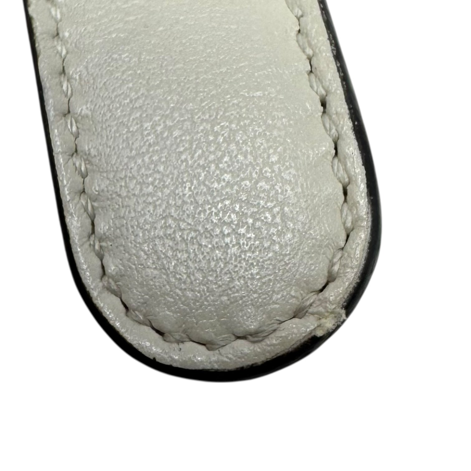 A few small flaws as pictured including light tarnishing on the hardware. Overall slightly misshapen from storage but can likely be restored by use and proper storage.