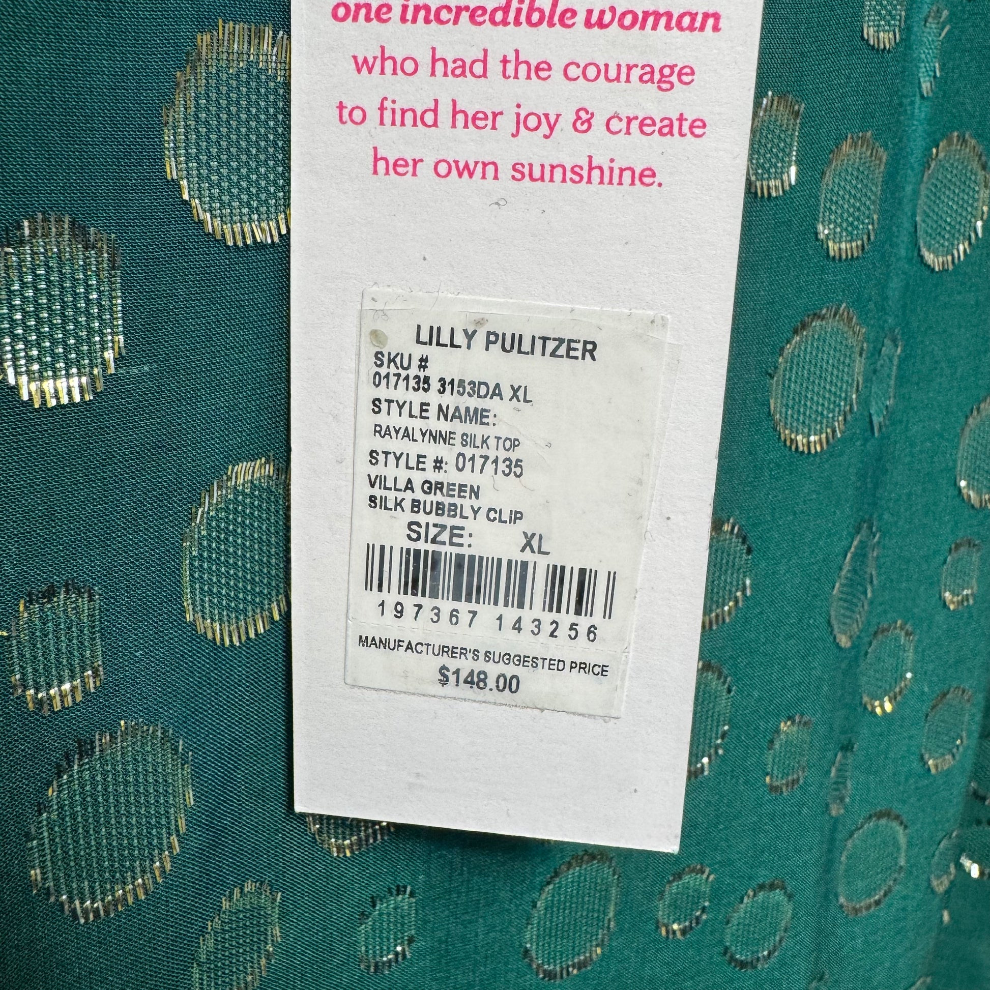 Turn heads in this stunning Rayalynne Silk Top by Lilly Pulitzer! Villa Green silk with bubbly clip detail, size XL.