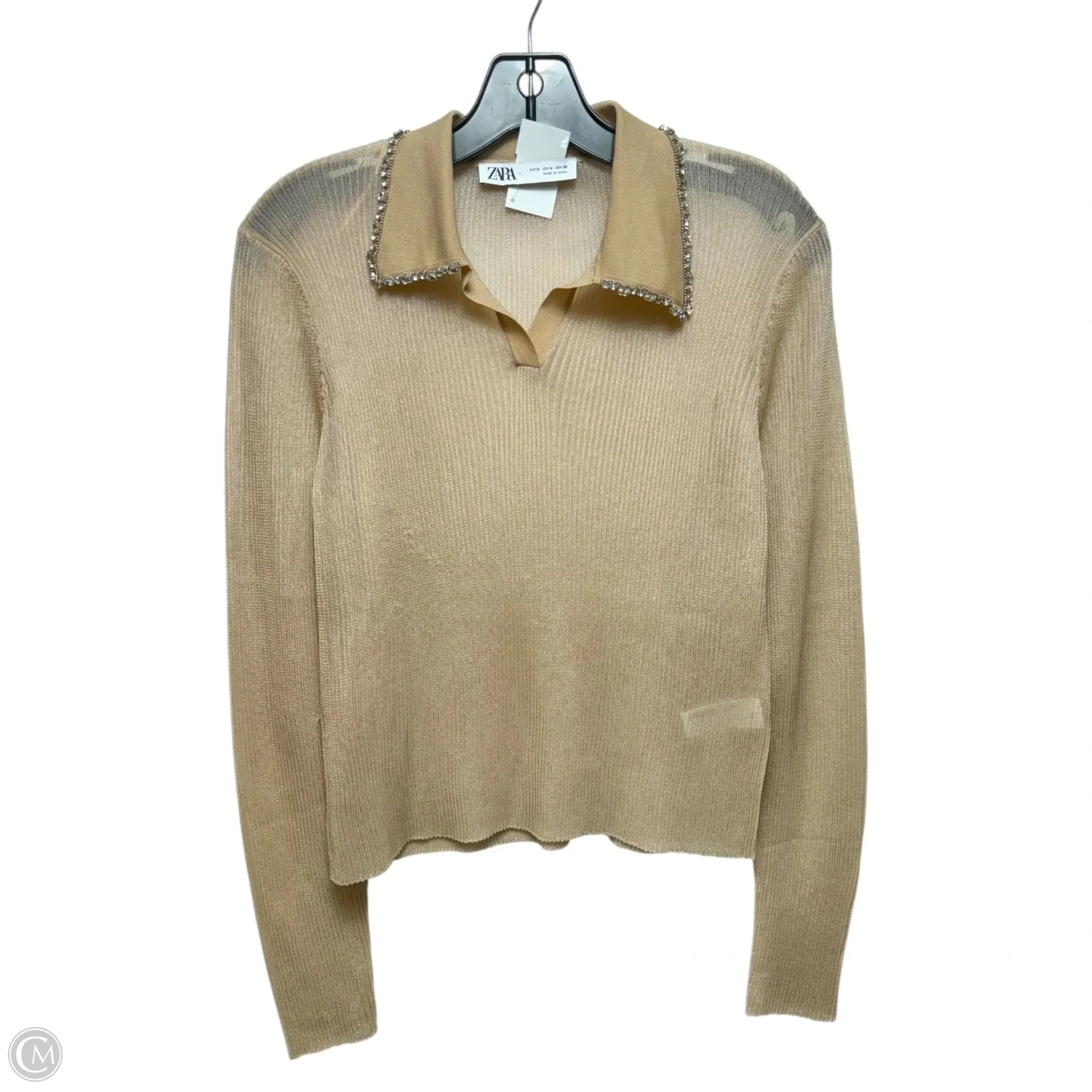 Sheer Embellished Collar Top Long Sleeve By Zara In Tan, Size: M