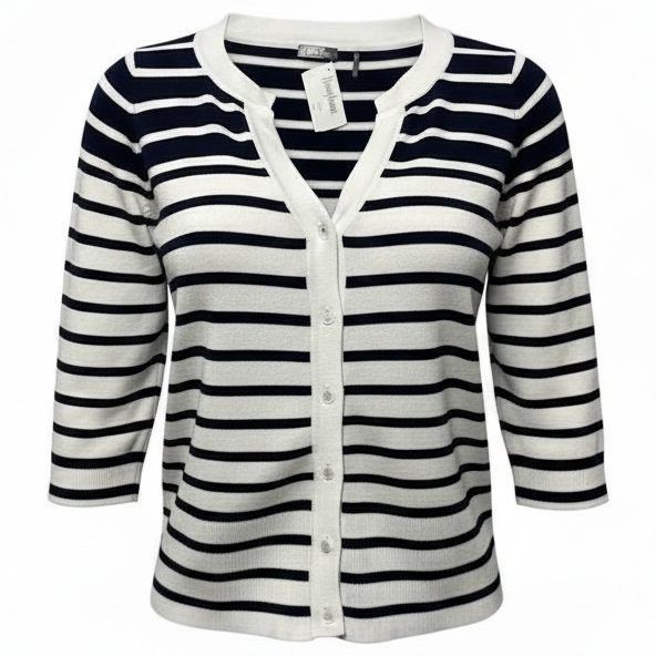 Elevate your ensemble with this exquisite Neiman Marcus striped cardigan. Size M, crafted with premium materials for ultimate sophistication.