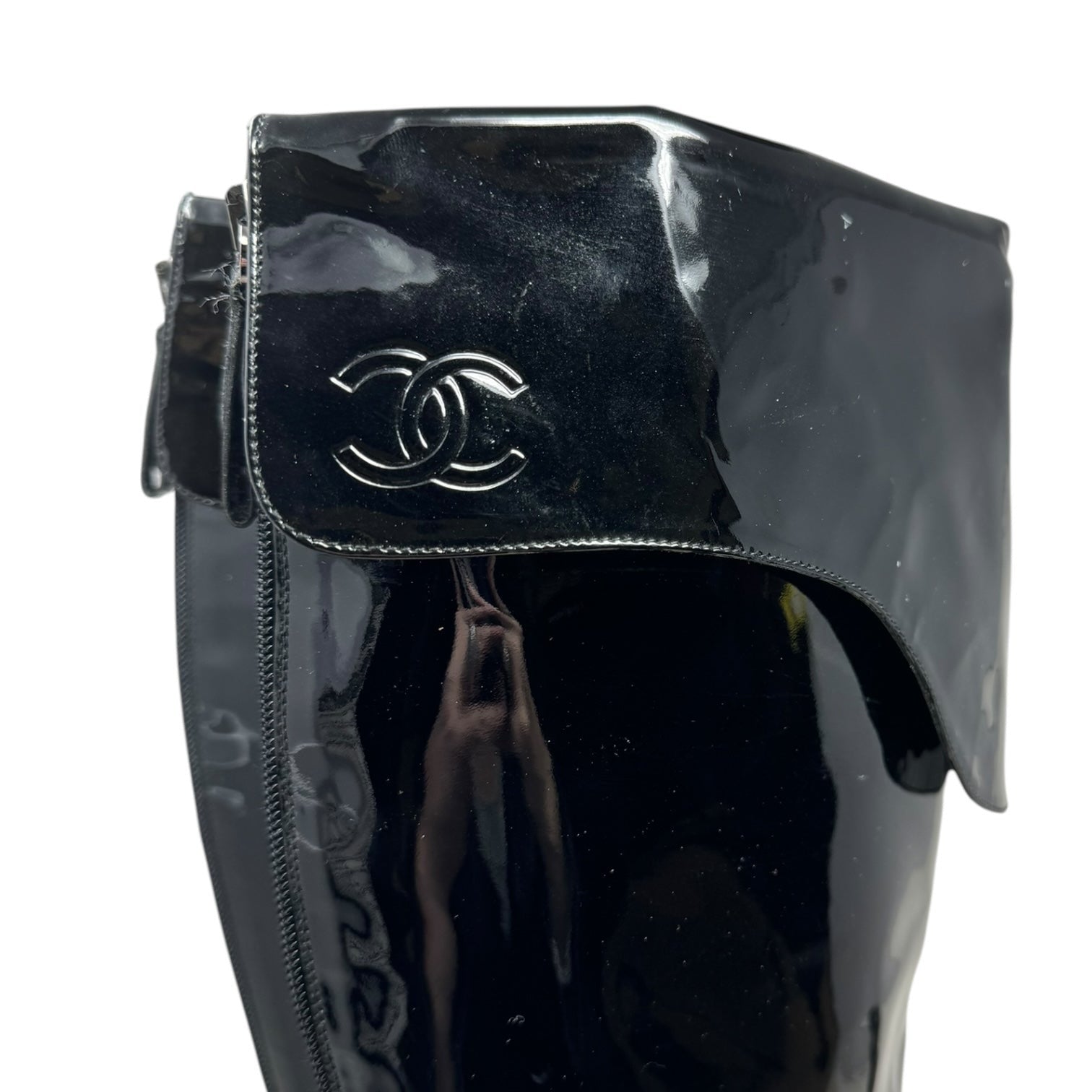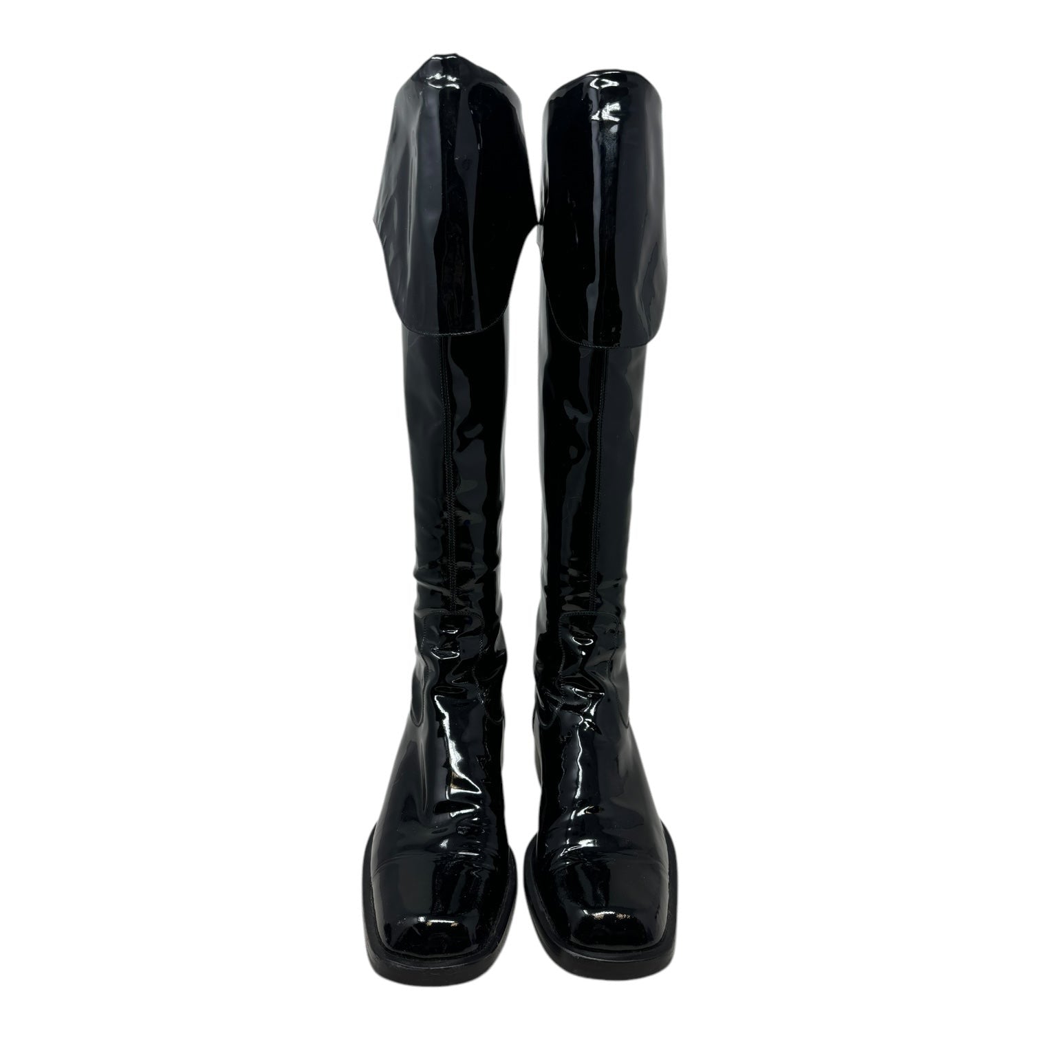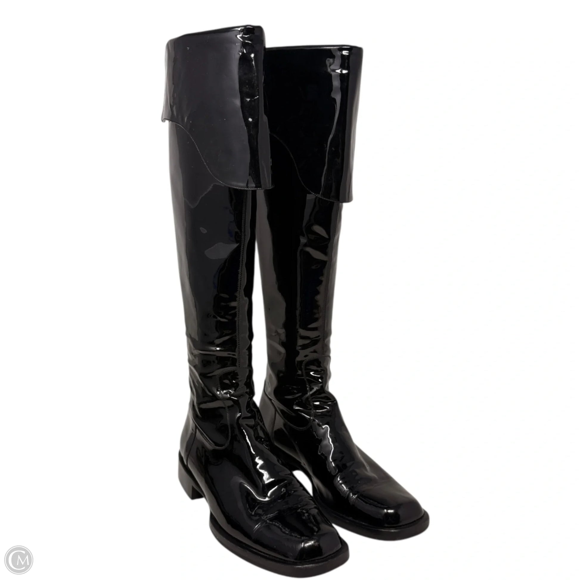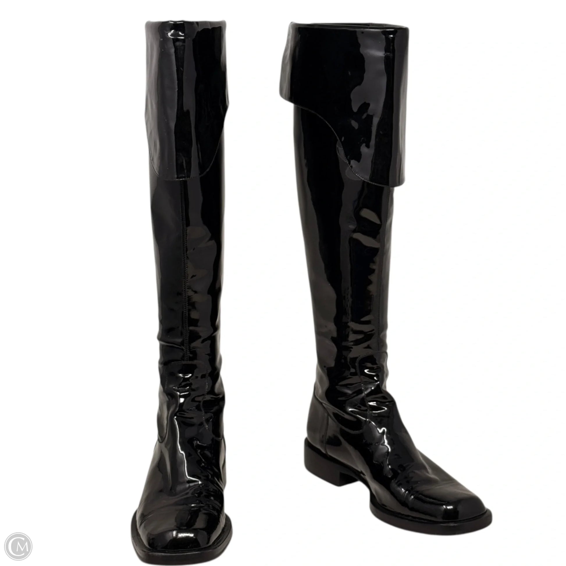 Vintage 2001 F/W Collection Patent Leather Cavalier OTK Boots Luxury Designer By Chanel In Black, Size: 7/37.5