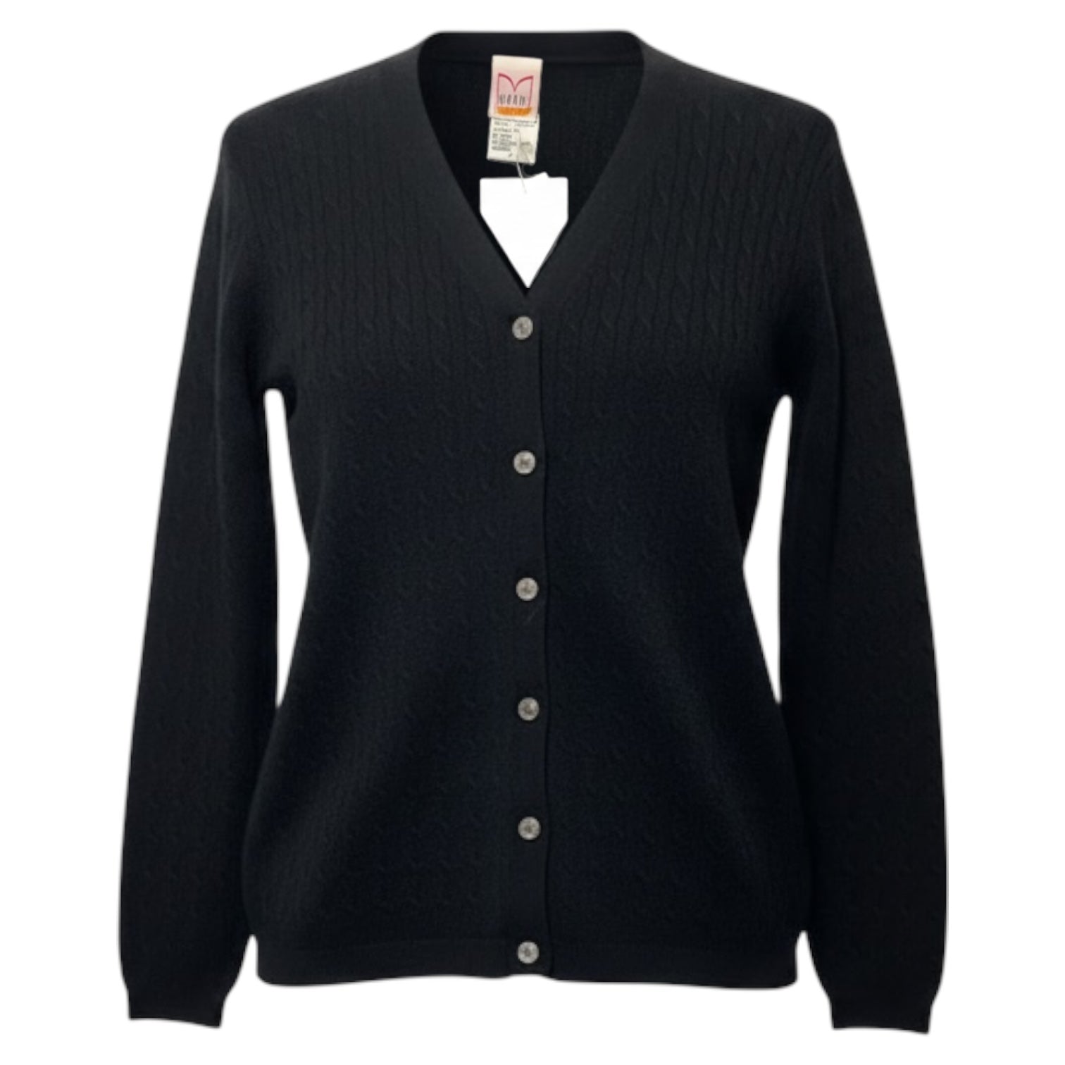 Wrap yourself in luxurious warmth with this vintage cable knit cashmere sweater cardigan by Mondi in classic black, size M. Embrace timeless style and cozy comfort all season long.